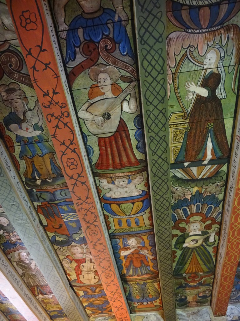 Como he dicho, los techos de este castillo son una maravilla: pintados de estilo jacobeo en varias de las habitaciones (en la de las Musas, la Sala de la Fama y en la Green Lady’s Room). Es una delicia recorrerlas mirando hacia arriba o ayudándote de los espejos que facilitan.