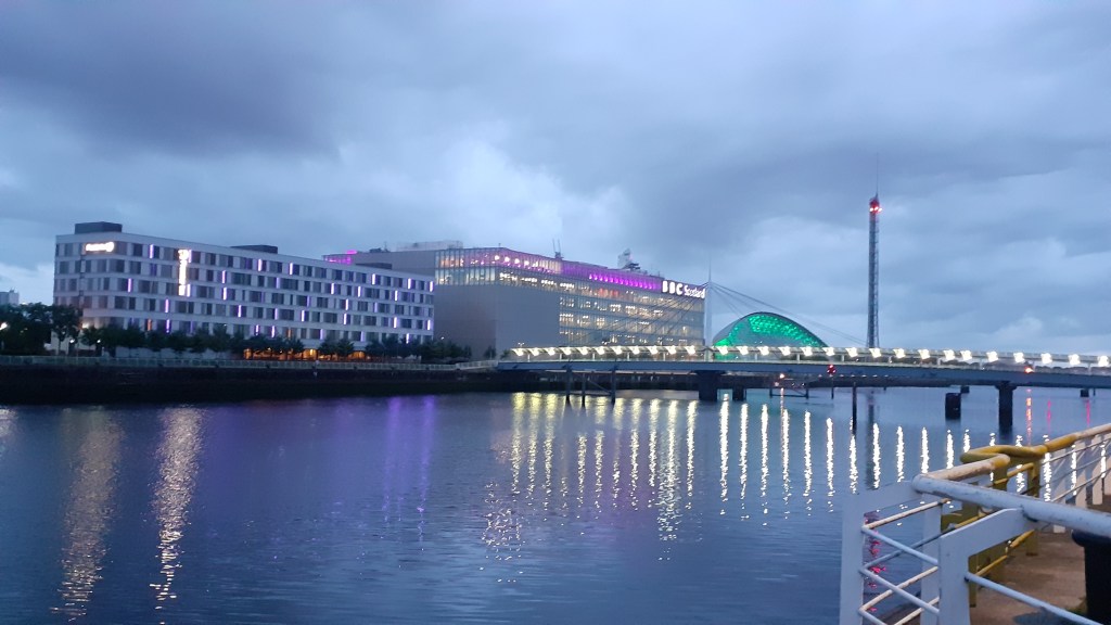 Es en este lugar donde se ha situado el auditorio, el OVO Hydro (la arena deportiva) y el SEC Centre, un centro de convenciones, además de hoteles de lujo de los que no entra ni sale nadie. En la otra orilla, las sedes de diversos medios de comunicación.