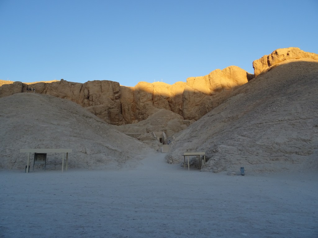 Se trata de una necrópolis del antiguo Egipto en la que están enterrados la mayoría de faraones del Imperio Nuevo (aproximadamente, entre 1550 a.C. y 1070 a.C.). Y aquí es cuando empezamos a ver los frutos del madrugón: nuestro autobús estaba de los primeros. Eso significa que teníamos la entrada de los primeros y montamos en el carrito que te acerca de los primeros.