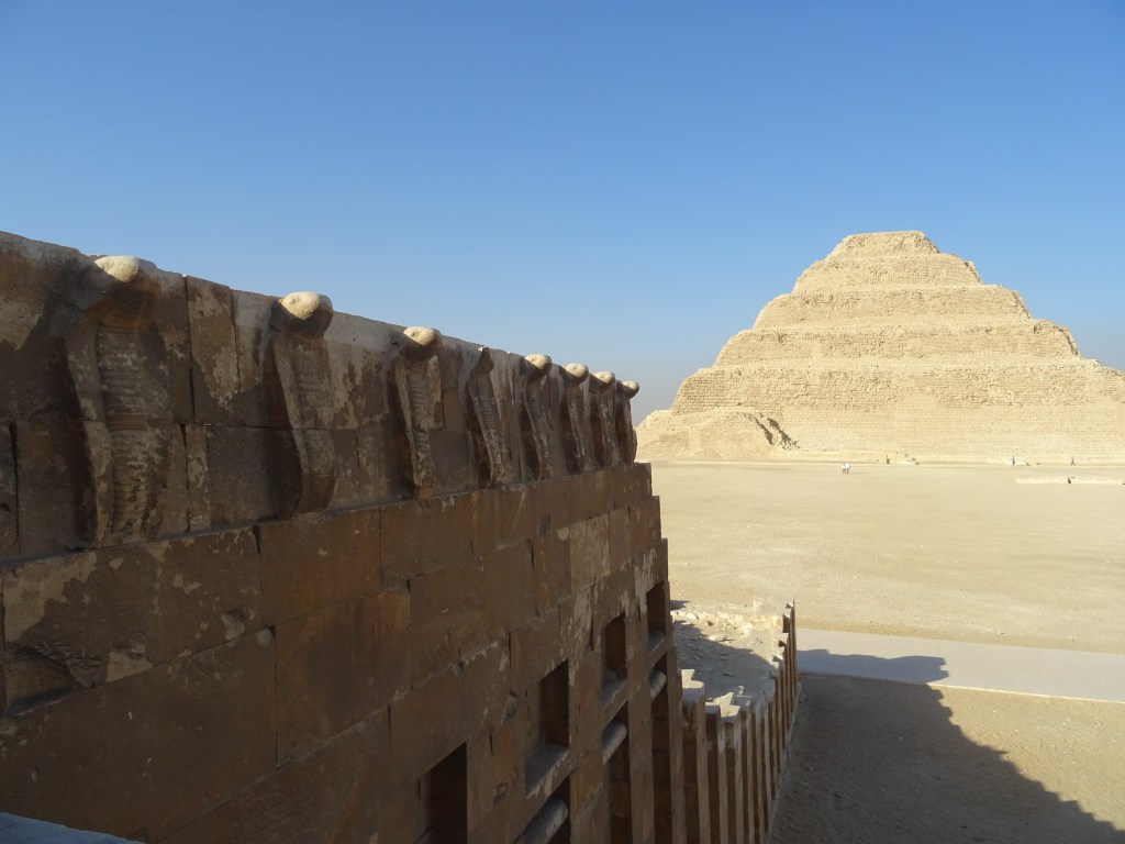 Continuamos a la pirámide escalonada de Zoser, que mandó construir el faraón Zoser a su arquitecto Imhotep en el 2650 a.C. Mide 60 metros de alto y está rodeada de un amplio recinto funerario, además, se trata del monumento en piedra más antiguo del mundo. Me llamó mucho la atención un muro decorado con un friso de cobras, en uno de los laterales del gran patio sur. La cobra representa a Uadyet, diosa de la destrucción, que protegía al faraón.