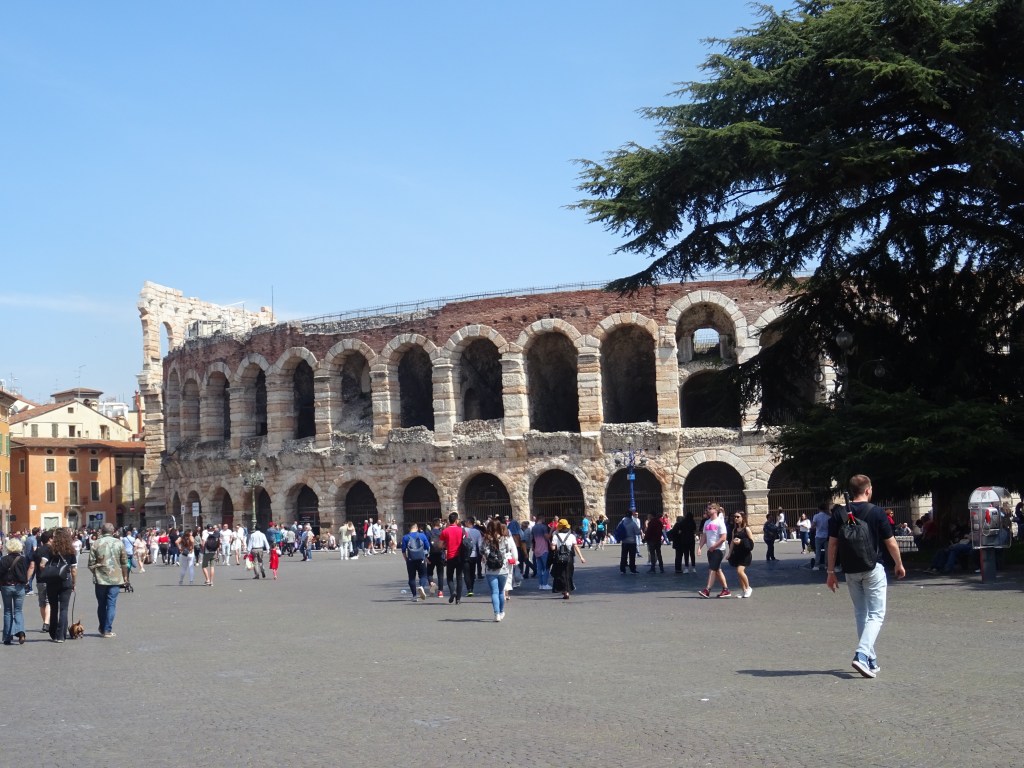 Cuando salimos, se aproximaba la hora de comer y, como no queríamos que se nos hiciera tarde y no encontrar nada, decidimos hacer un alto en el camino. Lo que más cercano nos quedaba eran todos los restaurantes y trattorias de la plaza del Brà, es decir, híper turísticos. Yo no estaba muy a favor de comer en un sitio así y prefería callejear un poco más. Era la única que apoyaba esta idea, así que no me quedó otra que ceder. Al final, nos sentamos en una terraza atestada de gente, viendo el coliseo y debo reconocer que no fue tan malo como pensaba. Se nota a la hora de pagar y en la calidad de la comida que no es Venecia, y eso que, como digo, la plaza es casi equivalente a comer en la Piazza San Marcos.