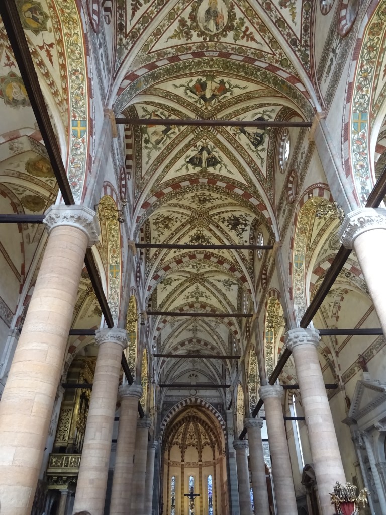 Fue en este momento cuando María y Laura se tuvieron que ir. Ellas volvían a Sevilla un día antes que Noe y yo. Verona nos estaba gustando mucho, es una ciudad que merece la pena, sin embargo, el cansancio acumulado de todo el viaje iba pesando. Aunque nos apetecía mucho cruzar el Adigio para ver el Castel Sant Pietro y disfrutar de las vistas, realmente, no disponíamos de tiempo suficiente, ya que el tren de vuelta a Venecia no nos esperaría. Dando un paseo sí que me llevé una última visita entrando en la Iglesia de Sant’ Anastasia, con un interior muy bonito, los techos coloridos son una maravilla. Un último recuerdo perfecto.