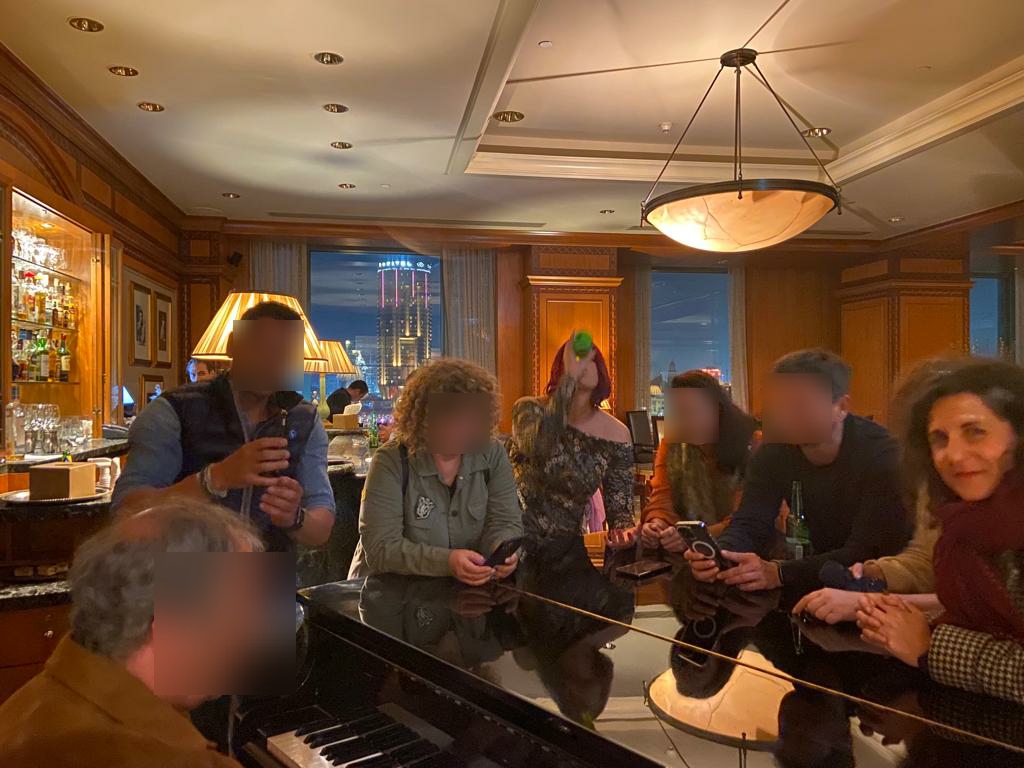 De las cancioncillas se pasó a canciones que todos los sabemos, por lo que el concierto se convirtió en un karaoke y los móviles salieron. Fotos y vídeos de Javier tocando, de nosotros cantando y bailando. Poco después, alguien tuvo la genial idea de avisar a los demás para que subieran a la planta 39. En pocos minutos, estábamos todos. Y nos dieron las 10, Corazón partío, I will survive, Your song, Michael Nyman… fueron cayendo una a una. Javier seguía incombustible al piano y nosotros, cantando y bailando.
