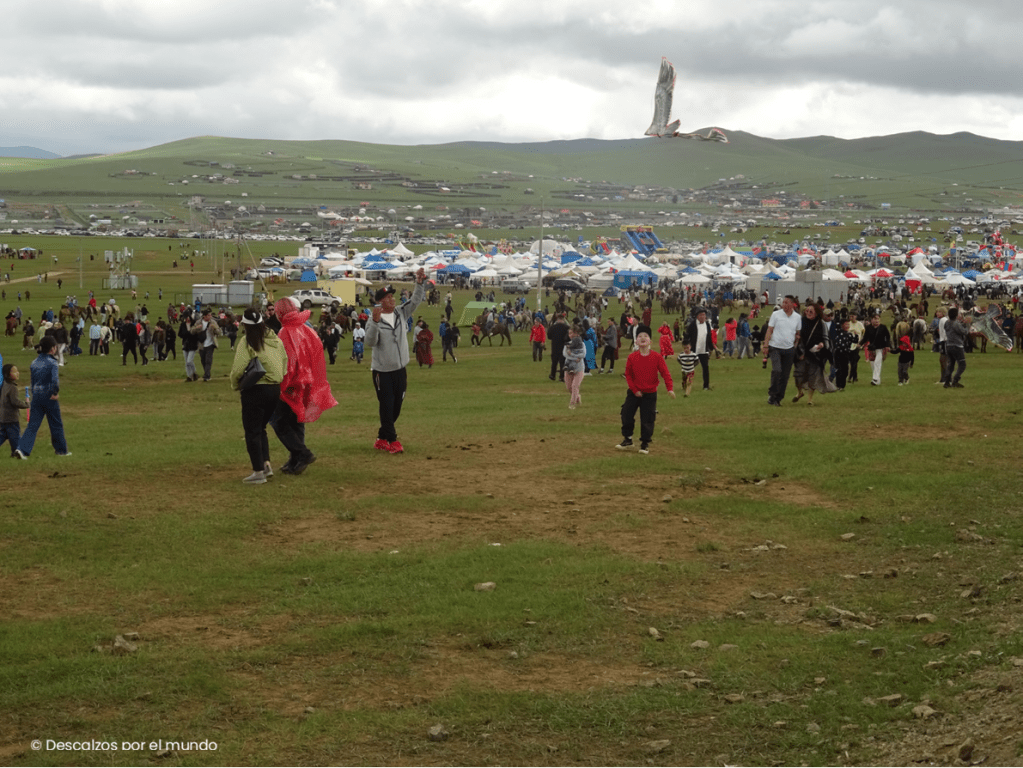 Sobre un escenario presidido por un retrato de Gengis Kan, comienza un desfile de acróbatas, músicos, bailarines, jinetes a caballo haciendo todo tipo de cabriolas, gente con sus camellos y yaks, cetreros vestidos con trajes típicos kazajos y con sus mejores halcones. Todo al ritmo de una música alta que no impidió alguna cabezada… demasiadas horas sin dormir.