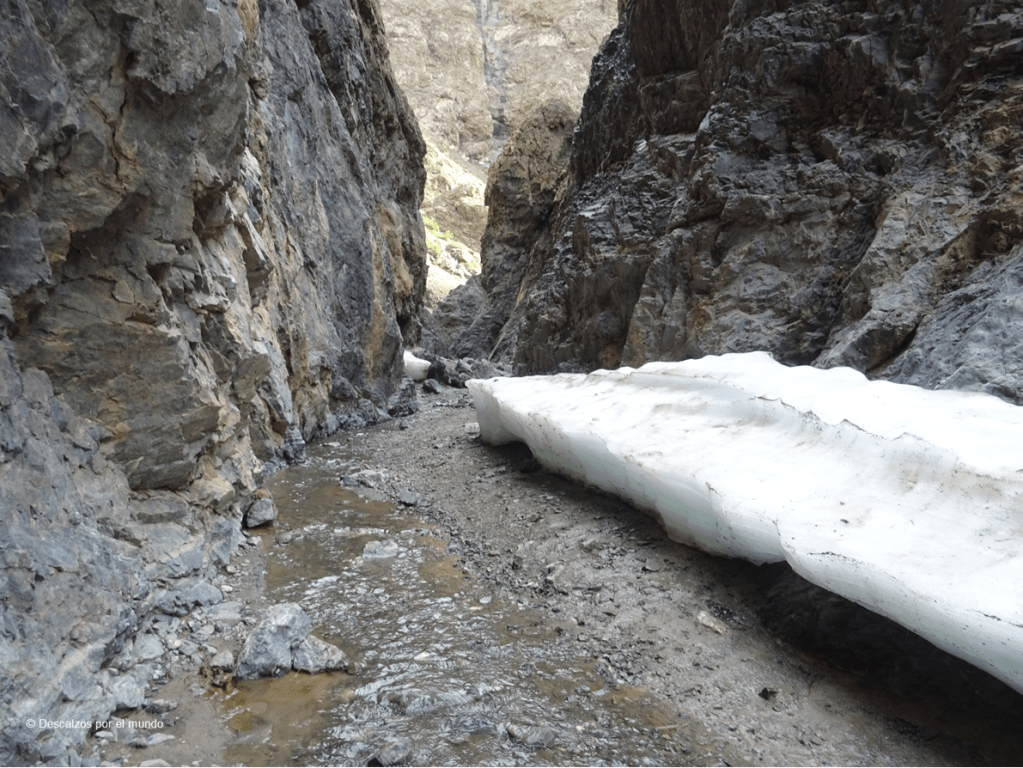 Las paredes son tan altas que proporcionan la sombra suficiente como para que se conserve, unido, además, a que el turismo masivo no ha llegado a la zona (¡menos mal!), descubrimos un bloque muy macizo de hielo.