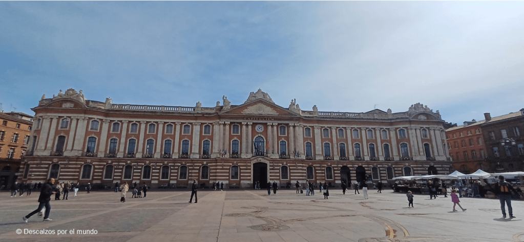 Y por fin llegamos al otro extremo de la rue du Taur: la plaza del Capitolio, que toma su nombre del edificio que hoy en día hace de Ayuntamiento y que se convierte en el centro neurálgico de Toulouse. La fachada de ladrillo y de piedra blanca data del siglo XVIII y el edificio se llama así por los capitouls, los ediles que gestionaban la ciudad entre los siglos XII y XVIII y que podemos ver representados en forma de ocho columnas de mármol a ambos lados del reloj.