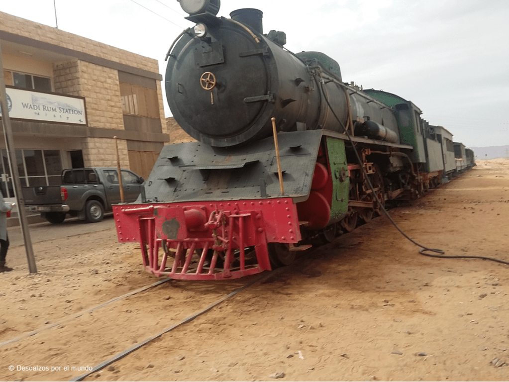 Llegamos por carretera, en el autobús en el que hicimos todos el viaje, hasta que se llega a un punto en el que el vehículo no podía continuar, y nos pasamos a otros más adecuados para el terreno. En ese momento paramos en un lugar peculiar: el tren de vapor de Al Hijaz. El que se ve en la actualidad está restaurado, la línea férrea fue construida en 1916 por el Imperio Otomano para conectar Damasco con Medina y La Meca. Por cierto, la persona que la destruyó es ya una conocida en este artículo: Lawrence de Arabia.