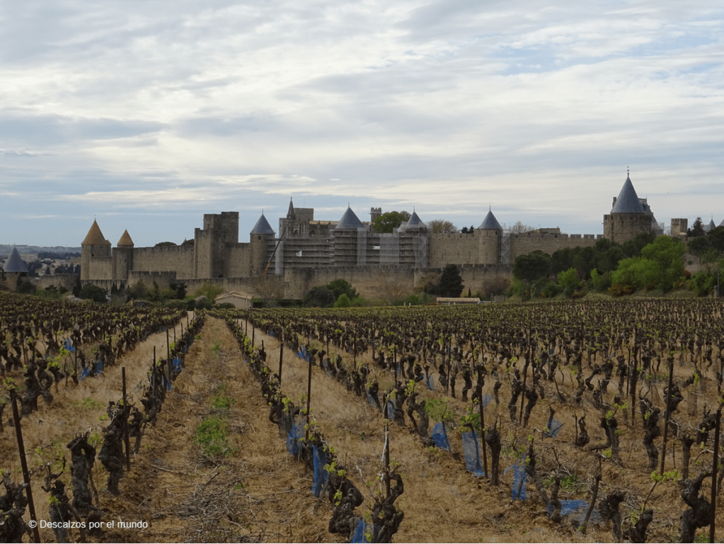 Hay otro punto fuera de las murallas del que se tienen muy buenas vistas. Sólo lo he visto mencionado en un sitio y, mientras que íbamos no nos cruzamos con ningún turista más. Saliendo por la Porte Narbonnaise, dejando el cementerio atrás, se llega a un viñedo y, con las murallas de fondo, se obtiene otra postal de las que se quedan grabadas en la retina. Como no siempre sale todo a pedir de boca, me gustaría comentar que, en los primeros días de la primavera, los viñedos no estaban especialmente esplendorosos, por lo que no queda tan bonito como se puede llegar a pensar. Seguro que en una época del año más propicia, las fotos son bastante mejores.
