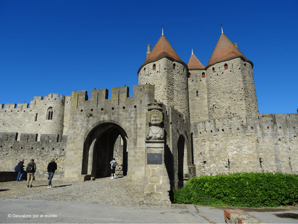 Accedimos rodeando las murallas por la calle Gustave Navaud. Se trata de una cuesta empinada, de esas de las que te hace echar el higadillo, pasando por todo el lateral de la muralla, deseosas de poder cruzarlas por fin, y llegamos a una de las puertas de acceso: la Porte Narbonnaise, donde se ubica el busto de la Dame de Carcas. Por cierto, Carcasona toma su nombre de esta mujer que consiguió, nada más y nada menos, que Carlomagno no traspasara las murallas durante 5 años de asedio. Os comparto este artículo de Historia en el que se habla de lo ocurrido.