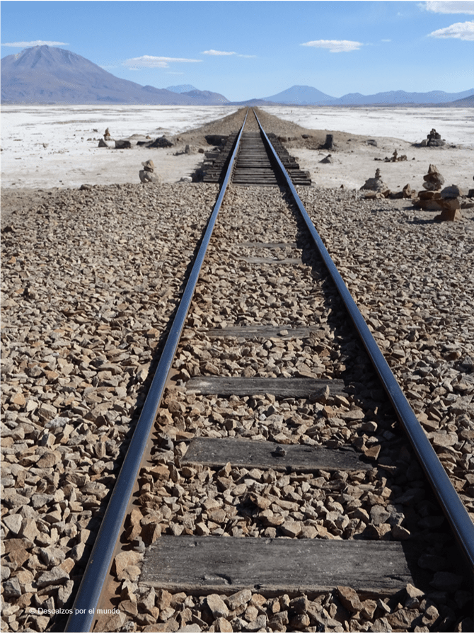 El salar de Chiguana se ubica en una depresión alimentado por pequeñas quebradas, por donde se filtra el agua desde las cordilleras. Se trata de un depósito salino de 415 km2 y en el que, adicionalmente, se hallan depósitos de bórax. Las vías del tren rompen la monotonía blanca del terreno. Un ferrocarril que une la Estación Avaroa y Uyuni y que, al no pasar en el rato que nosotros estuvimos por allí, las vías dieron lugar a bastante juego.