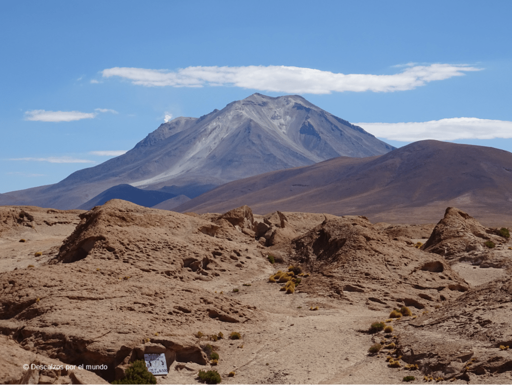 De fondo, sobresale una montaña, bueno, realmente, es un volcán, el Uturuncu, de 6020m de altura. Si nos hubiésemos internado en este paisaje, por la carretera que asciende por el volcán hasta las minas de azufre de Uturuncu, lo hubiésemos hecho por el puerto de montaña más alto del mundo, ya que está a más de 200m de altura respecto a la carretera de Khardung La, en la India.