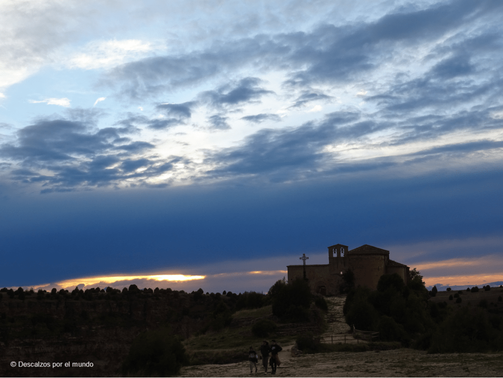 Dejamos el coche aparcado en el parking habilitado y empezamos a andar. El trayecto no tiene ningún misterio, es recto y sin dificultades. Como el sol ya estaba bastante bajo, los colores anaranjados del cielo añadían más magia a un entorno que, ya de por sí, es mágico y, en el primer mirador, la silueta de la ermita de San Frutos rompía el cromatismo.