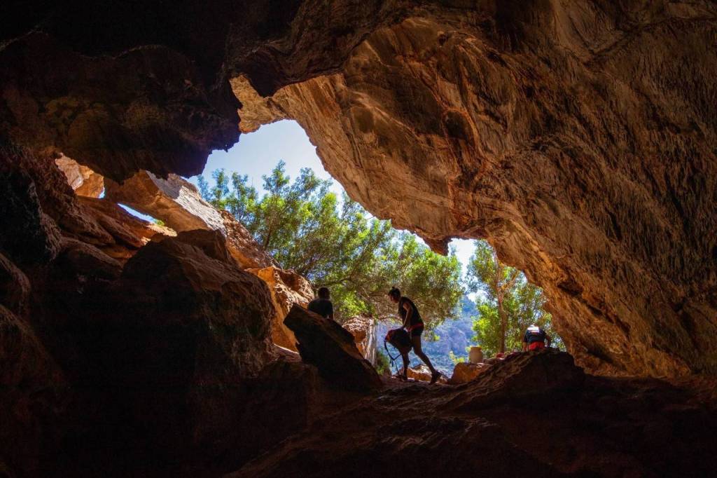 Llegamos a la entrada de la cueva y tenemos que dejar los móviles, más que nada porque lo tienes que llevar en la mano y no le vas a dar mucho uso. El monitor nos pide que no encendamos las linternas hasta que él nos diga. Le seguimos casi sin ver nada y, de repente, la luz se hizo (y nunca mejor dijo): encendió su interna y vemos una piscina natural, de agua totalmente cristalina, con unas rocas enormes que se ven varios metros en la profundidad.