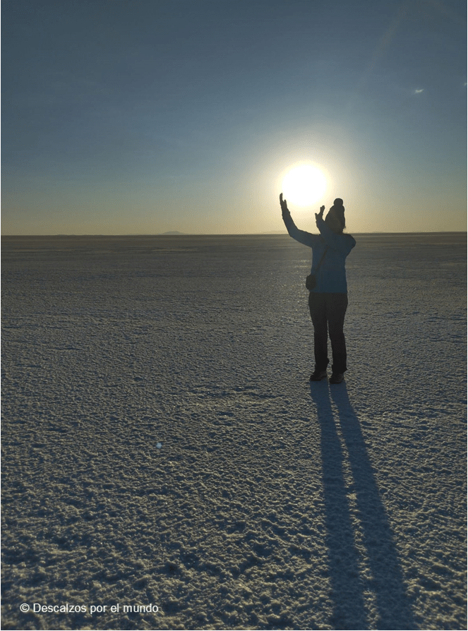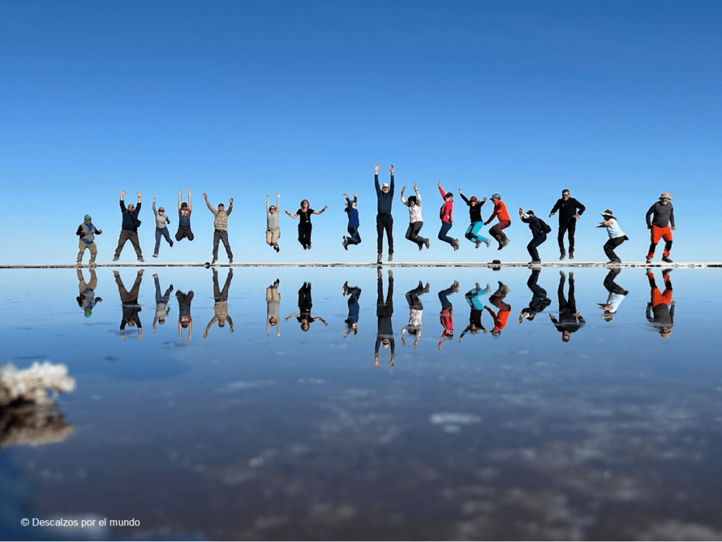 Cuando terminamos esta visita, nos espera una sesión de fotos de lo más divertida. Pese a que estamos en estación seca, los conductores tienen localizada cerca de la orilla una zona en la que queda agua encharcada. Y ya sabéis lo que toca en el salar de Uyuni con el agua que hace el efecto espejo: fotos de todo tipo que parece que han puesto un espejo debajo.