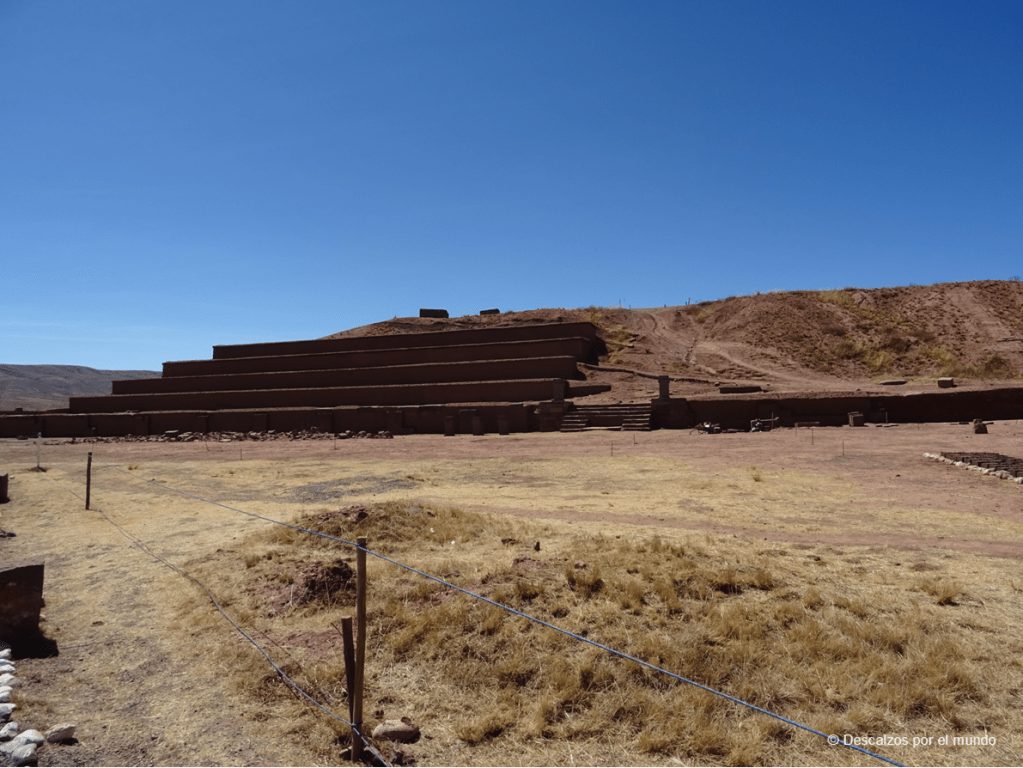 Por el sendero, nos acercamos hasta la pirámide Akapana. Parcialmente excavada, tiene una base de 16m y cubre una superficie de 200m2 . Se sabe que tenía 7 pisos y, aunque no se puede subir, en lo más alto hay un patio hundido en forma de cruz andina. No queda claro a ciencia cierta para qué se utilizó y hay distintas teorías, desde su uso como depósito de agua, templo ceremonial o estudio de la astronomía.