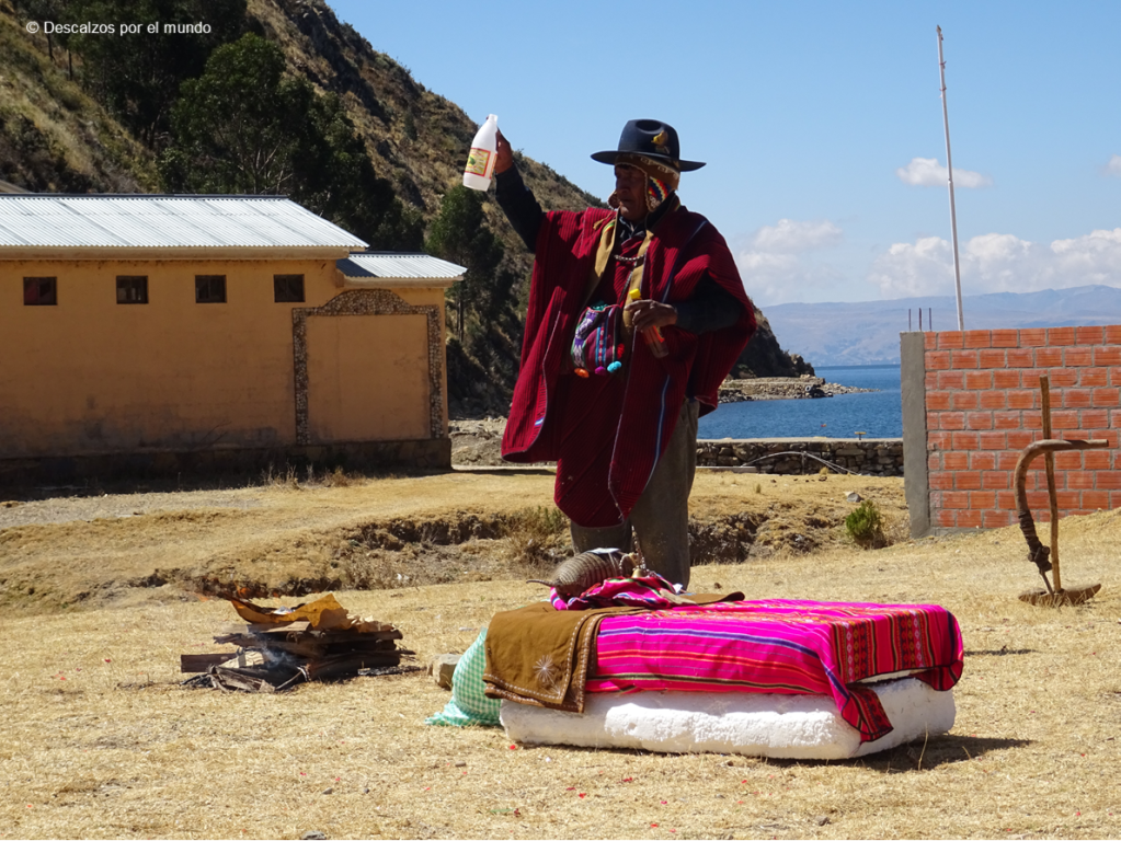 Con muchos de los artefactos que vimos en el Mercado de las Brujas de La Paz, empieza a verter alcohol y a quemar mientras que recita unas palabras de las que sólo podemos entender algunas sueltas, como Virgen de Guadalupe, Pacha Mama, trabajo y dinero.