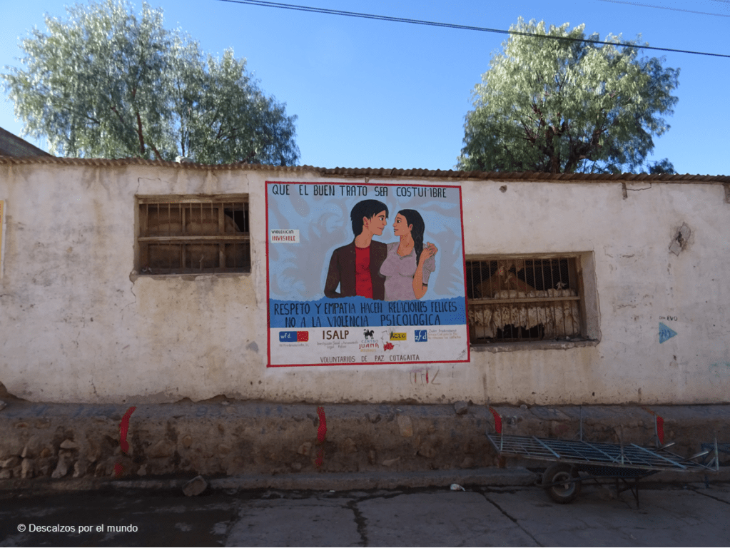 Me ha llamado la atención la cantidad de carteles y pintadas que se encuentran fácilmente en cualquier ciudad o pueblo dirigidas a niños y mujeres alertando sobre la violencia sexual y el maltrato. La boliviana es una sociedad machista y conservadora, por lo que explicar a los niños que un adulto no puede tocarte y los pasos a seguir en el caso de que se produzca es muy necesario y conveniente. De la misma manera, concienciar a las mujeres (y a la sociedad) de que el maltrato es un delito y que el amor no es la hostia. El centro Juana Azurduy hace un trabajo magnífico en Sucre y, entre otras muchas actividades, tiene la ciudad repleta de carteles con datos sobre la violencia hacia las mujeres.