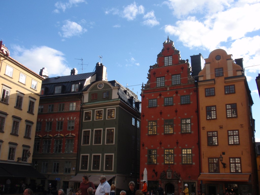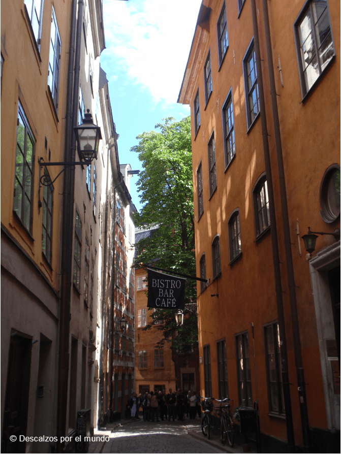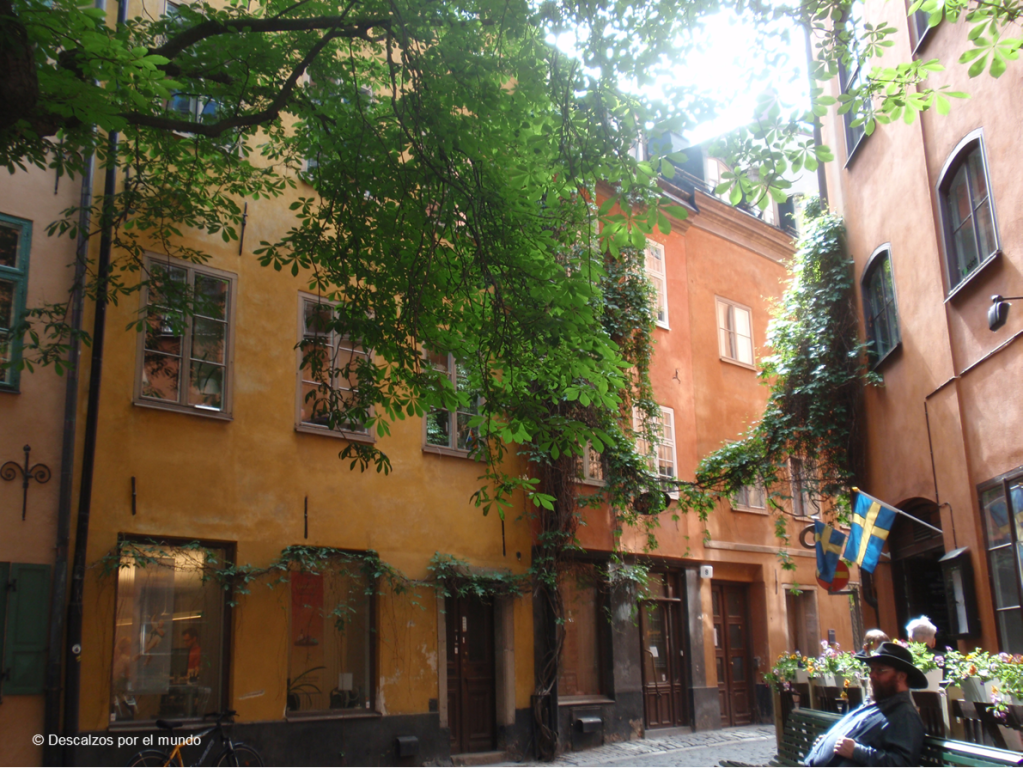 Gamla Stan es la zona más antigua de Estocolmo, es aquí donde nació la ciudad. Con un centro plagado de callejuelas, pequeñas plazoletillas, con bancos que invitaban a sentarse a la sombra y ver la vida pasar, edificios con una arquitectura similar, todos con las ventanas cerradas.