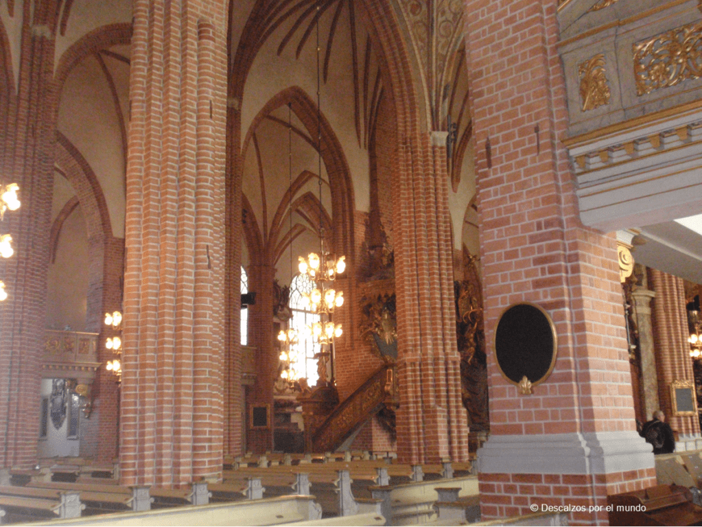 Sí que entramos a Sankt Nikolai kyrka, es decir, la Catedral de San Nicolás, también conocida como Catedral de Estolcolmo. Es la más antigua de la ciudad y está construida en ladrillo. El interior me pareció muy vistoso por el ladrillo visto, destacando el naranja y blanco, justo lo contrario que tenemos en mente cuando pensamos en una catedral. Demás, posee una escultura de San Jorge y el dragón del siglo XV muy llamativa, así como un pequeño cuadro de Jacob Heinrich Elbfas que representa un fenómeno atmosférico observado en Estocolmo el 20 de abril de 1535, llamado parhelio, además, es la representación más antigua de la ciudad.