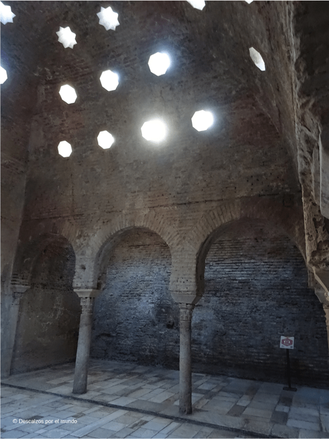En el Albaicín bajo no nos podíamos perder el Bañuelo. Una puerta minúscula en la misma Carrera del Darro, frente al Puente del Cadí, da paso a un lugar totalmente inesperado: un hamman del siglo XI. La sala principal, ubicada en el centro, es la sala templada, cubierta por una gran cúpula rodeada de otras tres más pequeñas, descansando sobre columnas de mármol y arcos de herradura. La iluminación es sorprendente: estaríamos a oscuras si no fuese por las claraboyas con forma de estrella de ocho puntas que simulan un cielo estrellado.