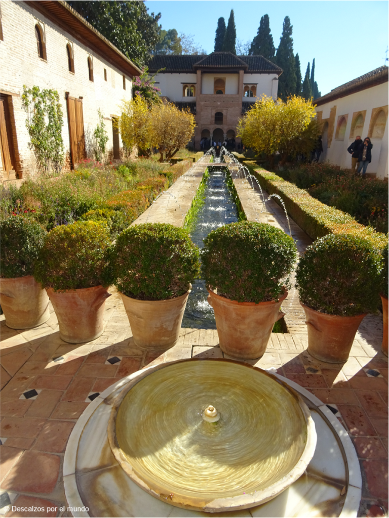 Pasamos por el Jardín de Lindaraja, umbrío y cerrado, que invita a sentarse; por los de El Partal, escalonados y con estanques, amplio y sintiendo el sol de los últimos días de otoño en la cara. Desde aquí, volvemos sobre nuestros pasos para visitar la Alcazaba.