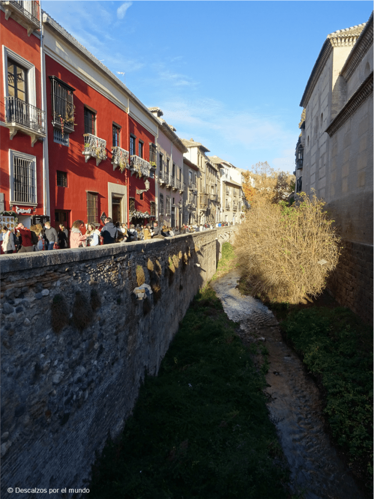 En paralelo al río, de piedra, sin aceras, abierta al tráfico rodado. Cuidado, viene un coche, y todo el mundo se pega a los edificios o al murete del río. Porque la Carrera del Darro es eso: a un lado, el río, enclavado entre árboles; al otro, auténticas maravillas arquitectónicas: el convento de Santa Catalina o las iglesias de San Pedro y San Pablo y de San Gil y Santa Ana.