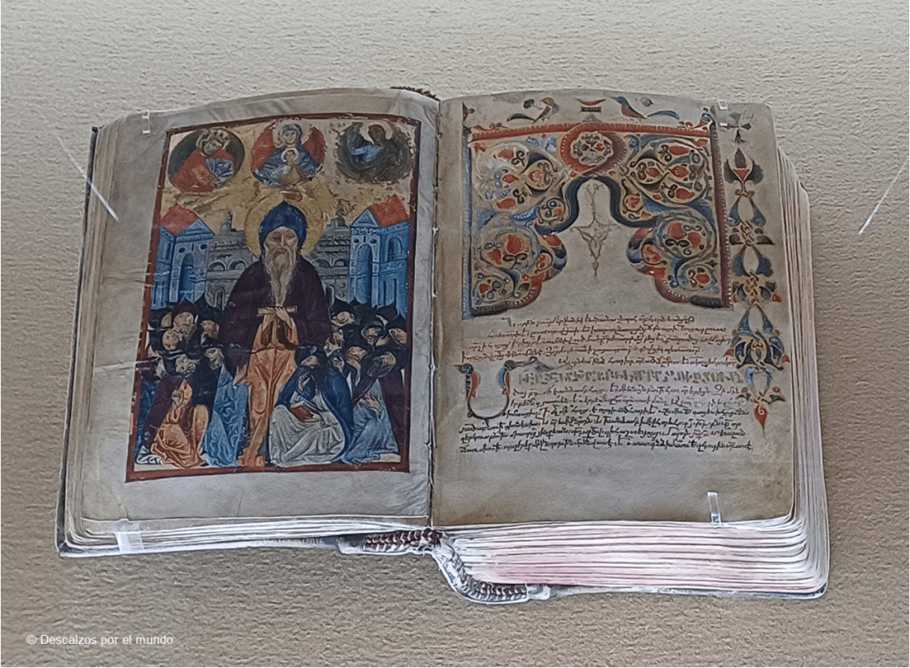 Teníamos contratada una visita guiada en español, aunque los carteles están también en inglés, y Mari, la guía que nos acompañó, nos habló de que se atesoran en torno a los 23.000 manuscritos, muchos de ellos bellamente ilustrados. Se exponen obraas en griego, farsi o árabe, además de armenio, con distintas temáticas, como filosofía, música, medicina o botánica y algunas con unas portadas que son auténticas obras de arte.