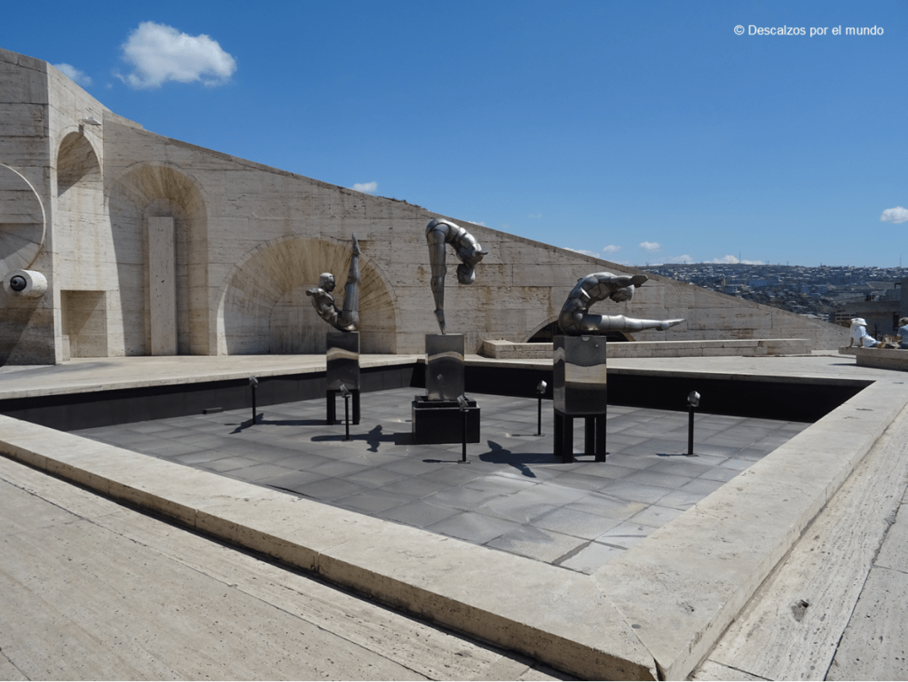 Cuando llegamos a lo más alto, salimos a la terraza. Nos reciben un conjunto de fuentes con formas de pétalos, las esculturas de los nadadores, Ereván a nuestros pies. Vamos bajando, de nivel en nivel. Todos iguales, todos diferentes. Merece la pena dedicarle tiempo, bajar pausadamente, entretenerse con los detalles y observar. Sí, aunque parezca mentira, esta belleza arquitectónica es de la etapa soviética.