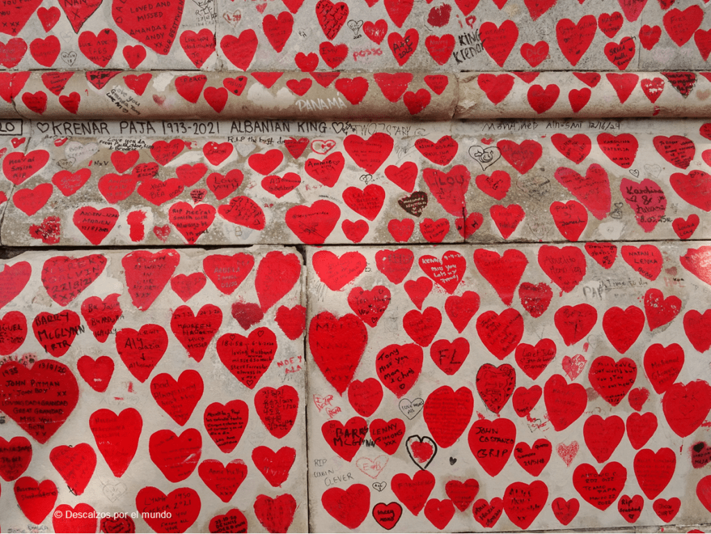 Para mí, la mejor manera de llegar a esta zona y disfrutar de la estampa que tantas veces hemos visto en la tele y en las películas, es cruzando el puente de Westminster. El Palacio de Westminster y el Big Ben ante nosotros, imponentes e imperturbables. Una maravilla. Pero, antes de ponernos en marcha, mejor hacerse a un lado en la orilla izquierda, justo donde el hospital St. Thomas y observar el entorno, con el río Támesis de fondo. Por cierto, no nos perdimos el memorial a los fallecidos por el COVID en el Reino Unido: un corazón para cada uno de ellos y siempre en los corazones.