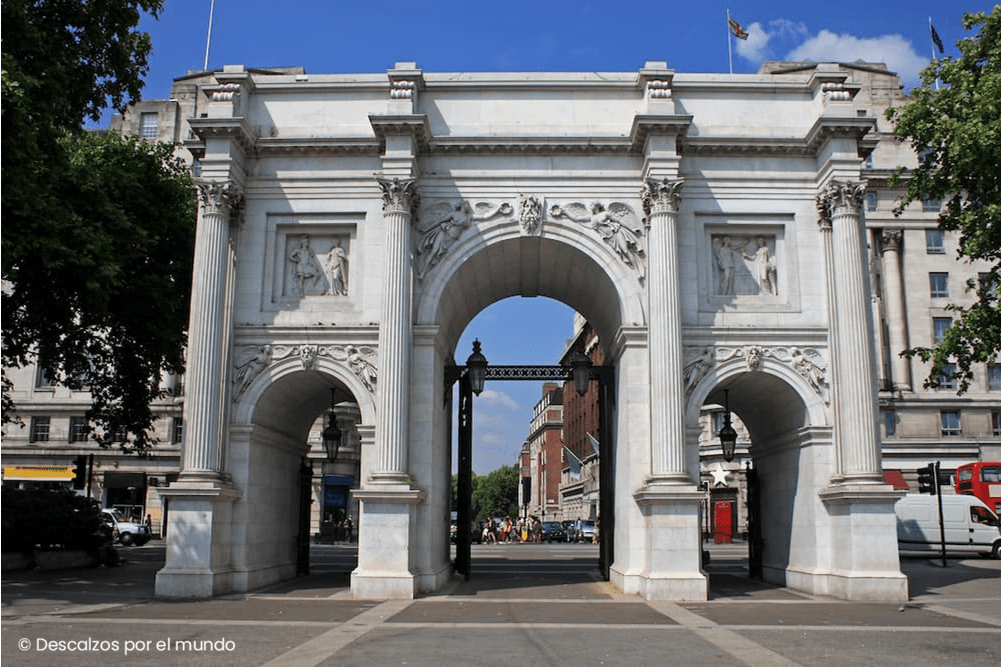 Marble Arch es un arco del triunfo en mármol blanco, diseñado por John Nash en 1827 con la finalidad de que fuese la entrada al patio de honor del Palacio de Buckingham. Sin embargo, pocas décadas más tarde, se trasladó al lugar en el que está ahora, un tanto aislado y descontextualizado.