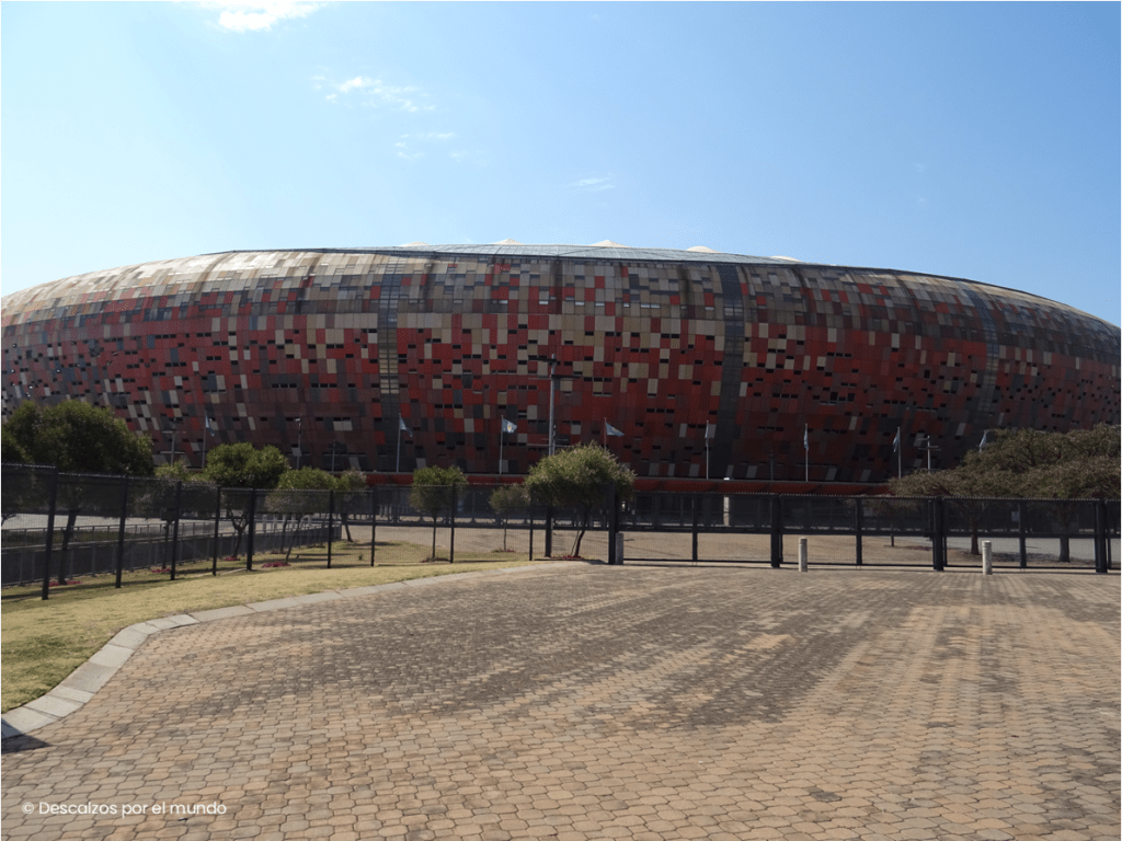 Nosotros llegamos en autobús y, la primera parada que hicimos fue en el estadio de fútbol FNB Stadium. No soy aficionada al fútbol, pero ellos presumen de estadio y les gusta que los turistas vayamos a conocerlo. Sólo vimos el exterior e hicimos algunas fotos y, por lo que nos explicaron, el diseño buscaba que el estadio se asemejase a una calabaza.