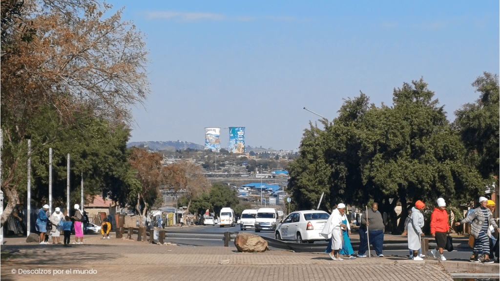 Cuando salimos del museo, seguimos el trayecto que llevó la manifestación. En el suelo queda marcado con un camino estrecho a medio ajardinar, hasta que llega a la calle Kumalo Main Road, en la que son los árboles los que lo marcan.