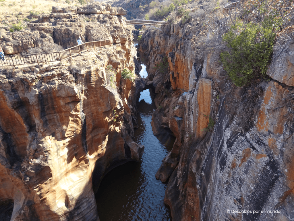 Se trata del resultado de la erosión del agua en la roca. Donde los ríos Blyde y Treur se juntan, erosionan las formaciones rocosas rojizas. Cavidades cilíndricas, cascadas y saltos de agua, piscinas naturales que, con el calor que hace, invitan a darse un baño o, por lo menos, a remojarse los pies.