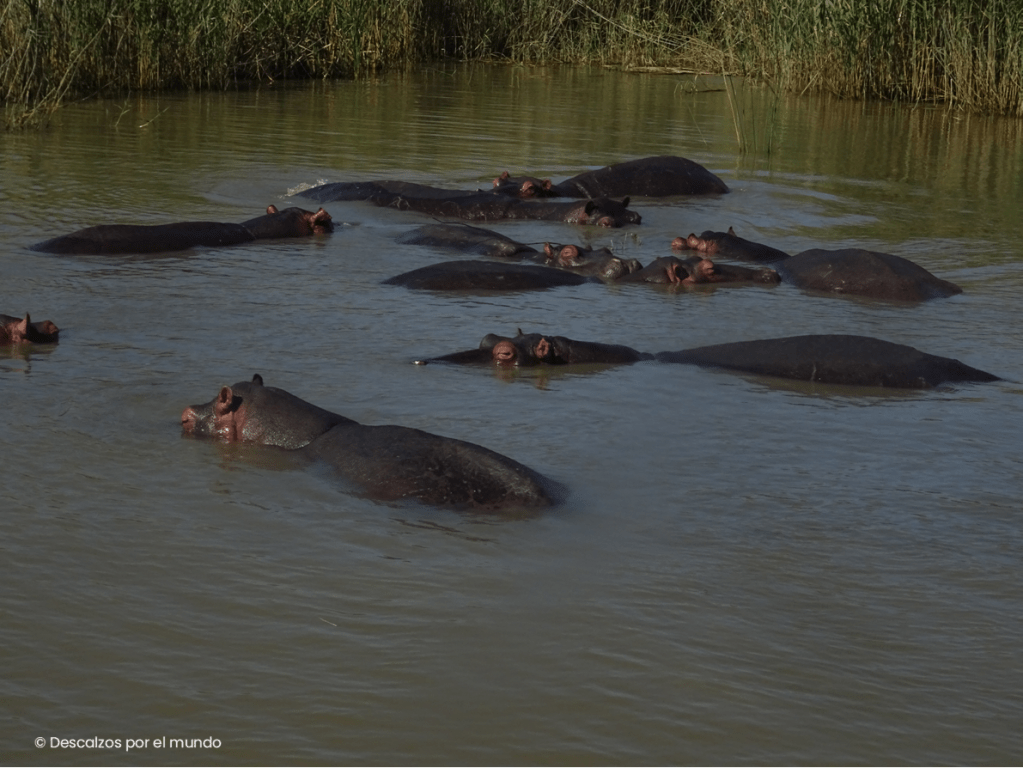 Cuando menos lo esperamos, nos topamos con la primera manada de hipopótamos: todos en silencio para que no se asusten (y no les dé por atacar).
