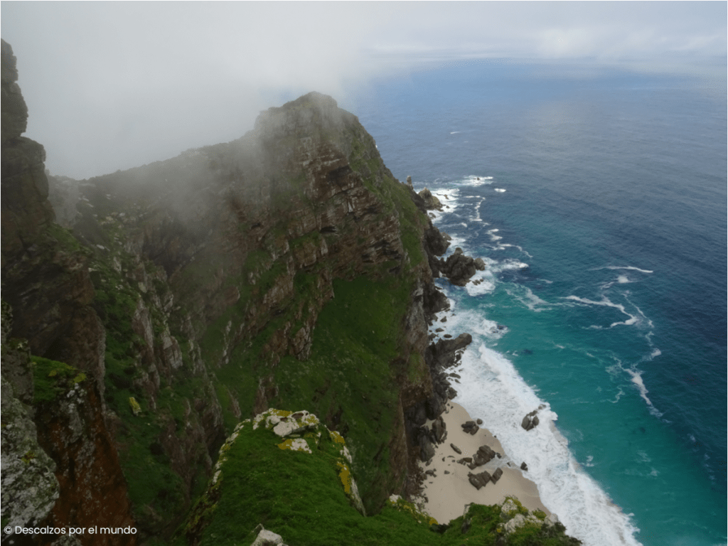 Bueno, la vida es así, unas veces se gana y otras no. Tocaba recoger y bajar, que nos dirigíamos, esta vez sí, al cabo de Buena Esperanza. Sin embargo, el destino se apiadó de nosotros, se levantó algo de viento y las nubes se movieron. Subimos corriendo de nuevo al faro y ahí estaba esperándonos: unas vistas inimaginables. Una pequeña playa de arena blanquísima y un agua azul turquesa gracias al sol. ¡Un espectáculo!
