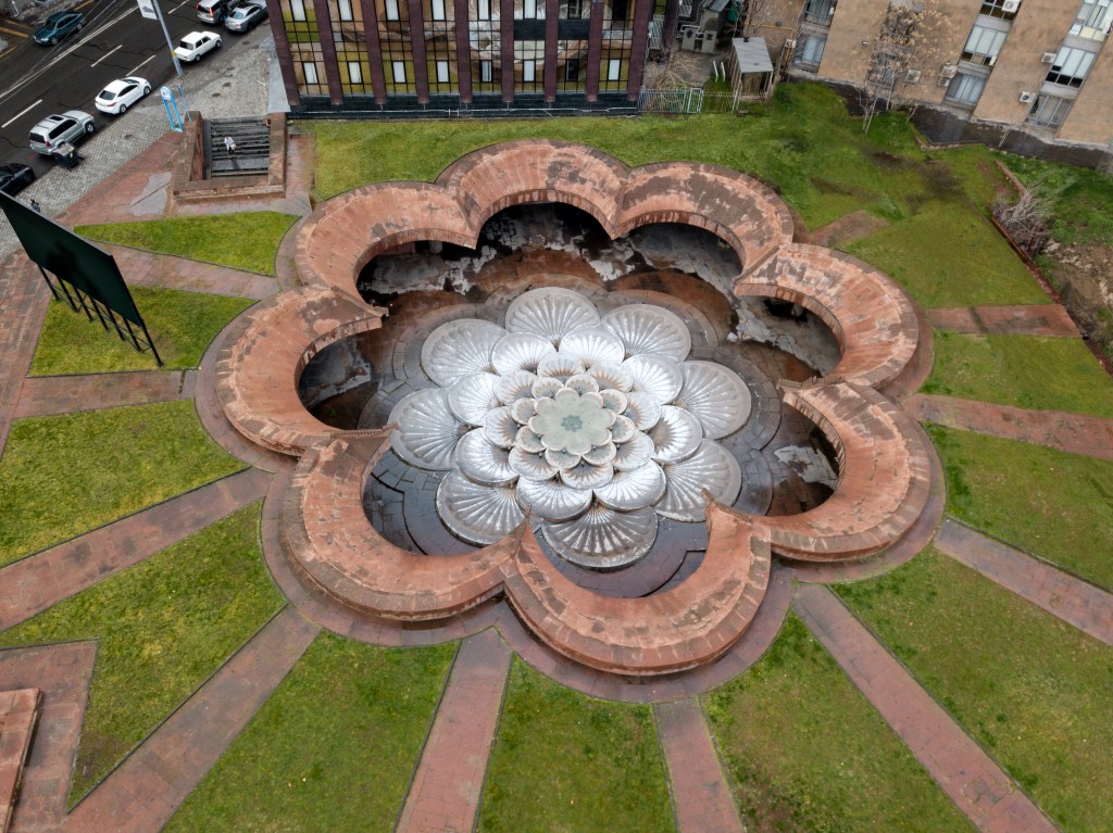 Hice una foto y, ya en casa, buscando información, vi que se trataba de la Universidad Estatal de Ingeniería de Armenia, en concreto, el Instituto de Ingeniería Mecánica, Sistemas de Transportes y Diseño. Construido en la década de 1980, al más puro estilo brutalista. Como no creo que sea capaz de recordar un nombre tan largo, en mi memoria perdurará como el edificio de los tréboles.